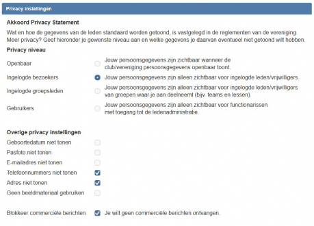 Je kunt o.a. aanvinken wie je gegevens mag inzien (bijv. alleen leden) en welke persoonsgegevens getoond mogen worden. De persoonsgegevens komen nooit openbaar op onze website of clubkanalen te staan. Ze zijn wel te bekijken in kanalen die alleen voor Merletten-leden toegankelijk zijn, zoals onze Club App en het afgeschermde gedeelte van de website.